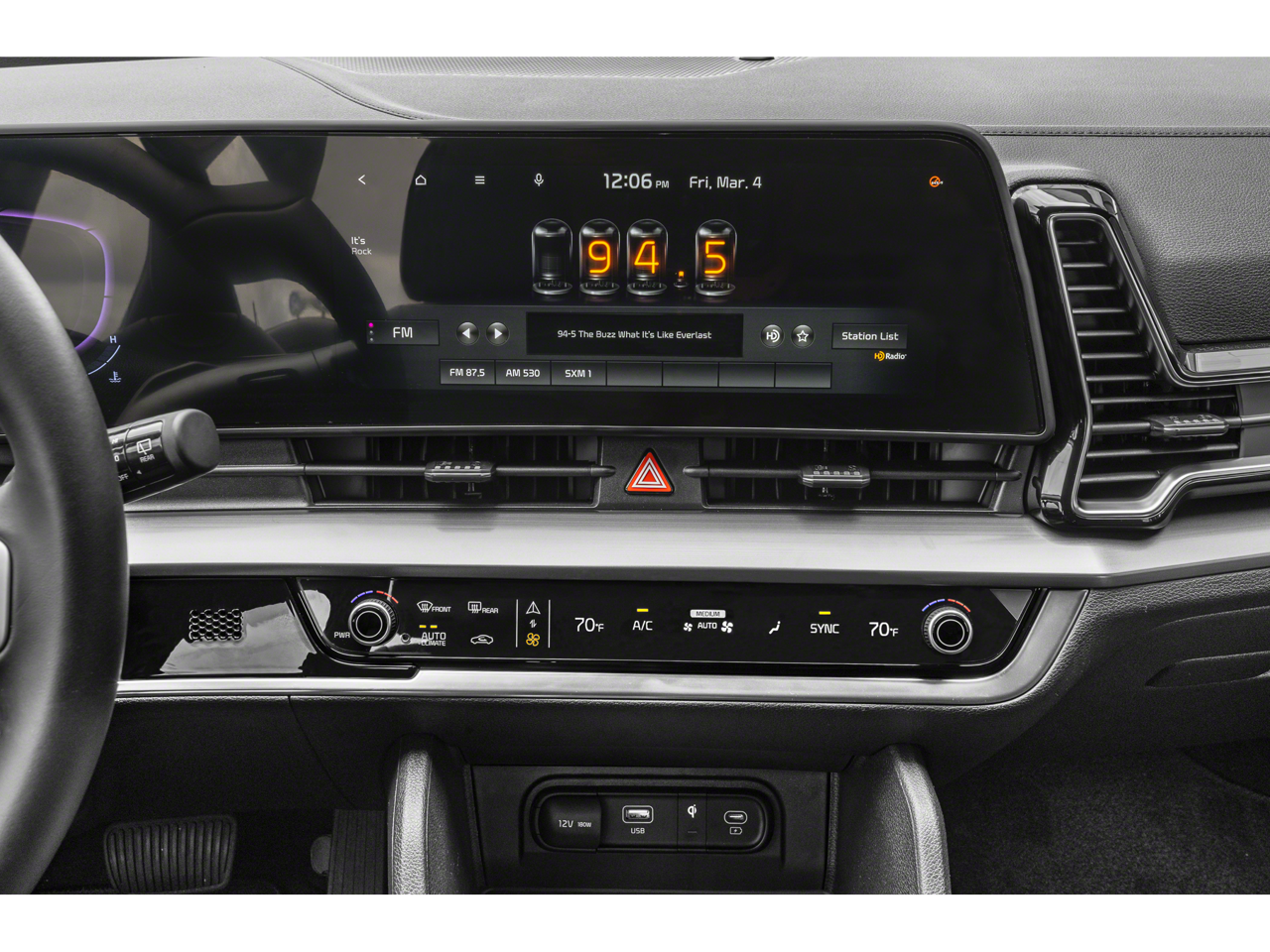 - Radio: AM/FM/HD Audio System -inc: 12.3" touchscreen w/navigation, 6 speakers, wired Apple Carplay and Android Auto, UVO telematics, voice recognition, SiriusXM, steering wheel mounted audio controls and Bluetooth phone and streaming audio